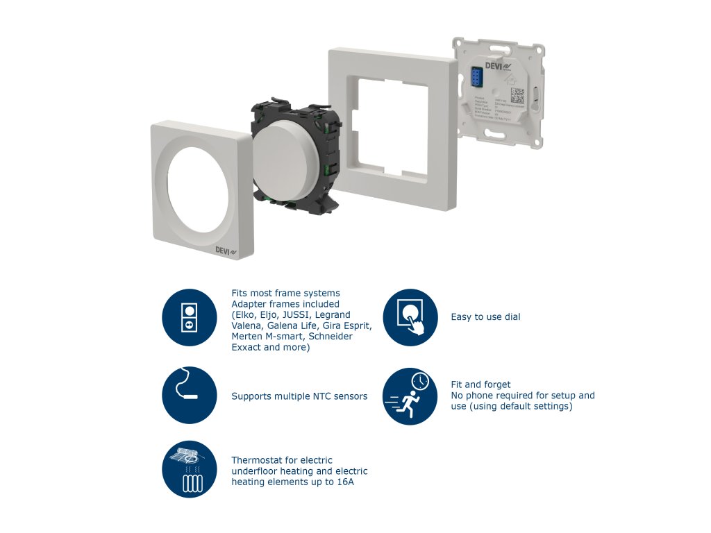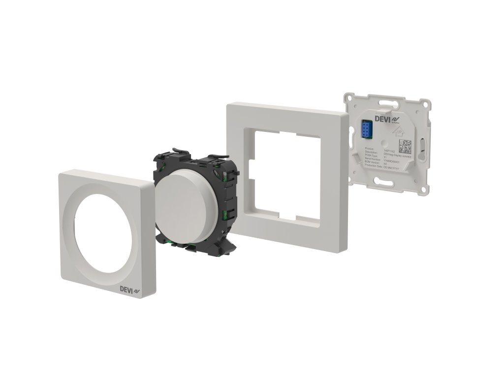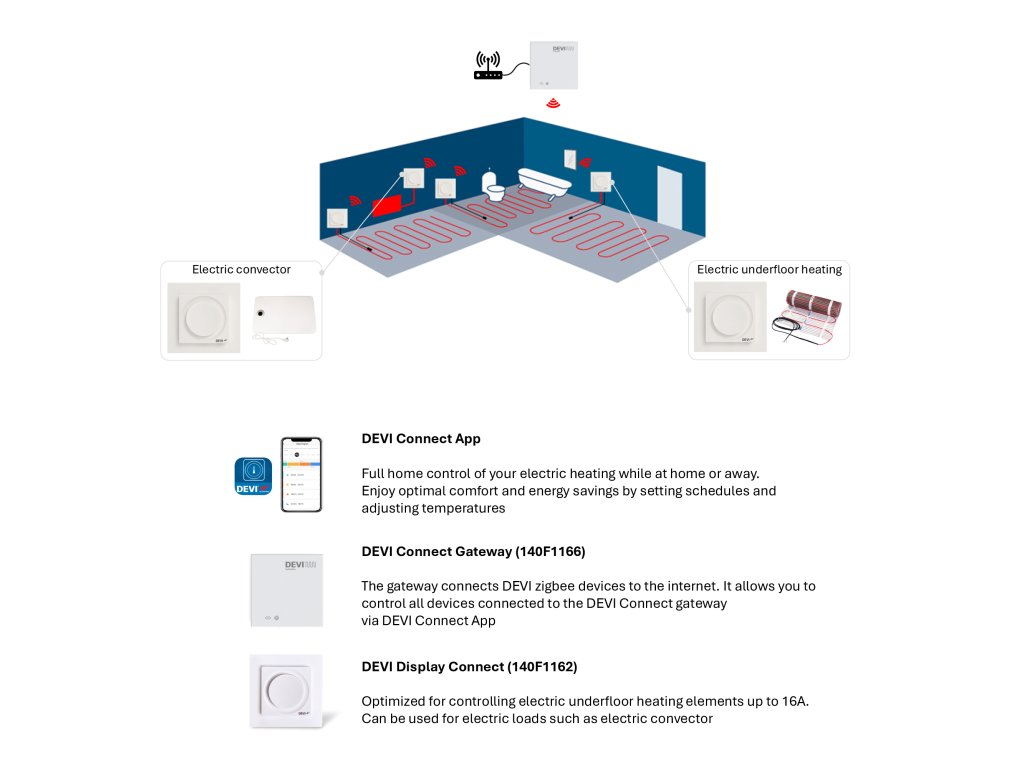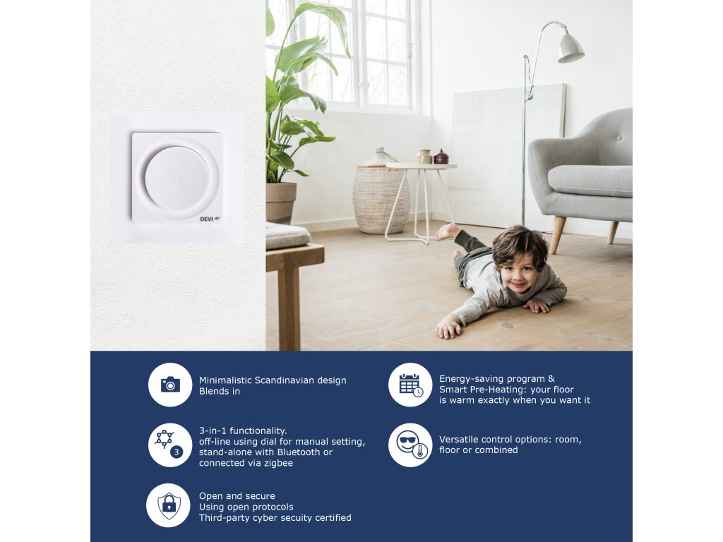 DEVIreg Display Connect je intuitivní programovatelný termostat s časovačem s možností připojení přes Bluetooth i Zigbee pro kombinovanou regulaci teploty v místnosti nebo podlahy, který splňuje normu Eco design Lot 20 a používá se k ovládání elektrických podlahových topných těles. Termostat je určen pouze pro pevnou instalaci. Díky speciálně navržené dvoudílné konstrukci je vhodný pro širokou škálu rámů. Termostat je vybaven otočným ovladačem a displejem, které umožňují intuitivní ovládání.